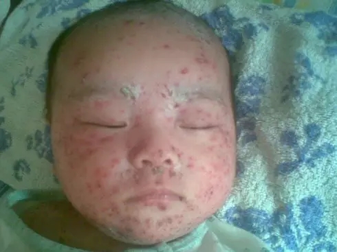 表現(xiàn)為皮膚潮紅,小斑丘疹上溢出淡黃色脂性液體覆蓋在皮疹上,以后結(jié)成較厚的黃色痂皮,不易除去,以頭頂及眉際、鼻旁、耳后多見,但是癢感不太明顯。